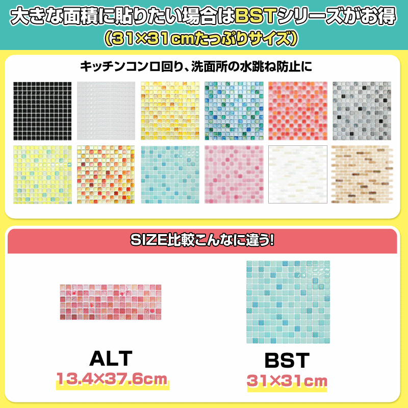 防水/防汚も 【サイズ違い・別シリーズもございます】 お洒落なキッチンシート モザイクタイル シール BST 【キッチン トイレ 洗面所のインテリアに最適 】 貼るだけシールタイプの簡単施工!【安心の難熱素材】【ガラスタイルの質感を再現】壁紙 シール・ウォールステッカー タイプ <製品の特性> ・透明かつ滑らかなガラスタイルの様な外観で、壁面やタイルにお洒落なアクセントを加えます。