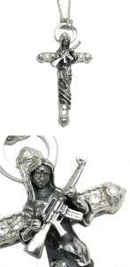 マシンガンを抱いたビーナスの背後にクロスを配した、争いから生まれる嘆き・悲しみを表現したネックレスです。